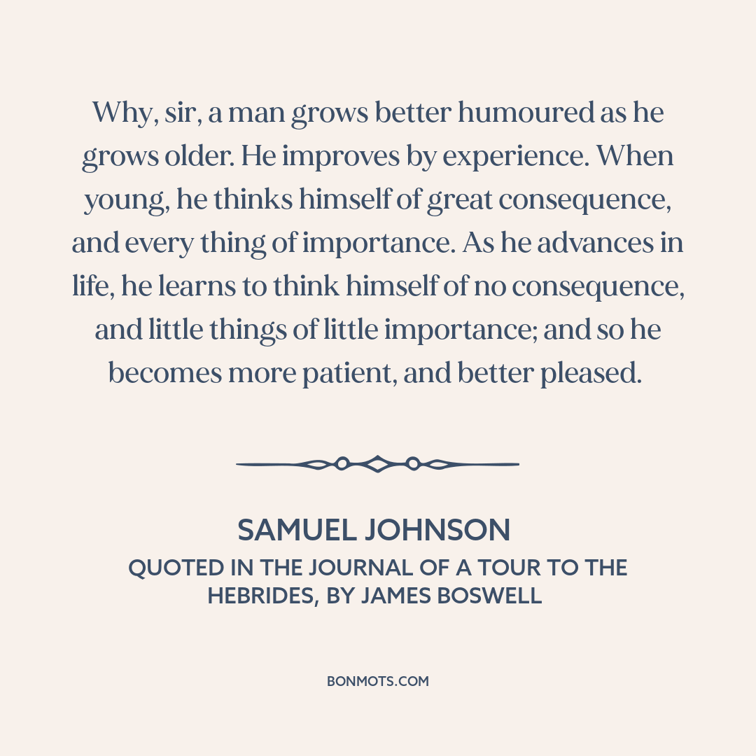 Why, sir, a man grows better humoured as he grows older. He improves by experience. When young, he thinks himself of great consequence, and every thing of importance. As he advances in life, he learns to think himself of no consequence, and little things of little importance; and so he becomes more patient, and better pleased.