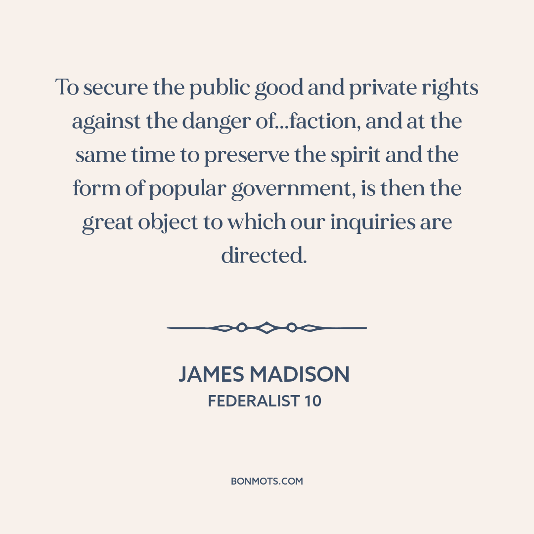 To secure the public good and private rights against the danger of...faction, and at the same time to preserve the spirit and the form of popular government, is then the great object to which our inquiries are directed.