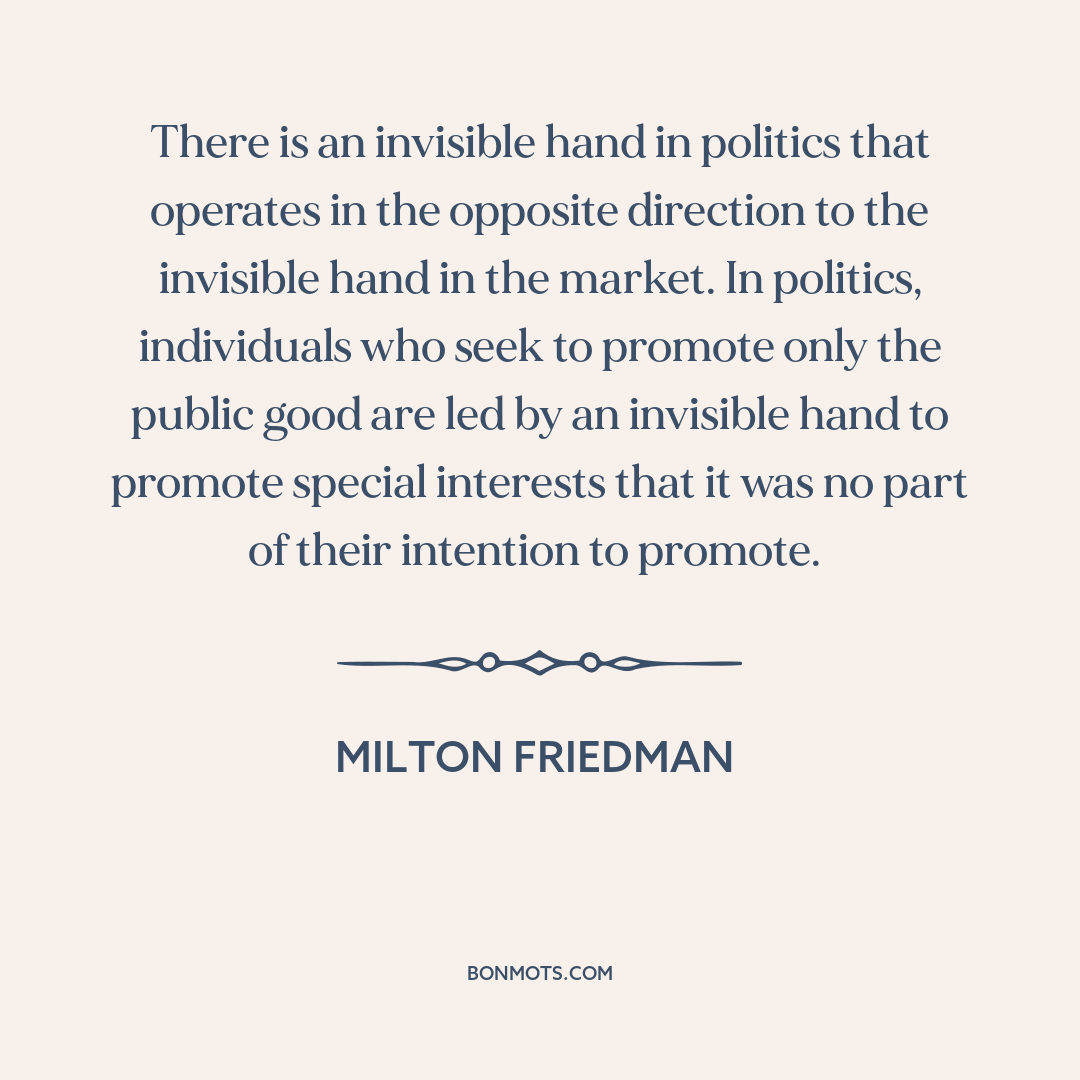 There is an invisible hand in politics that operates in the opposite direction to the invisible hand in the market. In politics, individuals who seek to promote only the public good are led by an invisible hand to promote special interests that it was no part of their intention to promote.