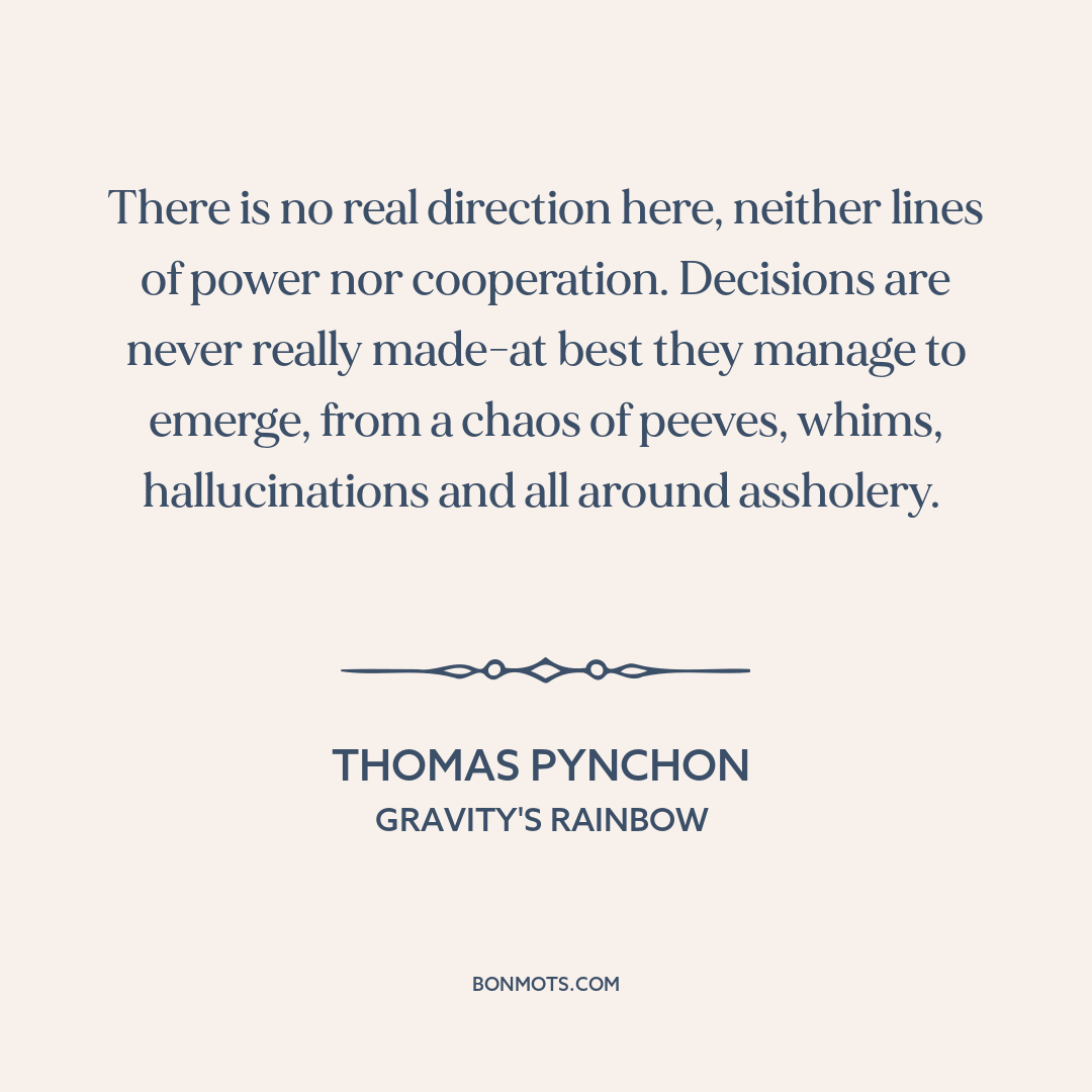 There is no real direction here, neither lines of power nor cooperation. Decisions are never really made-at best they manage to emerge, from a chaos of peeves, whims, hallucinations and all around assholery.