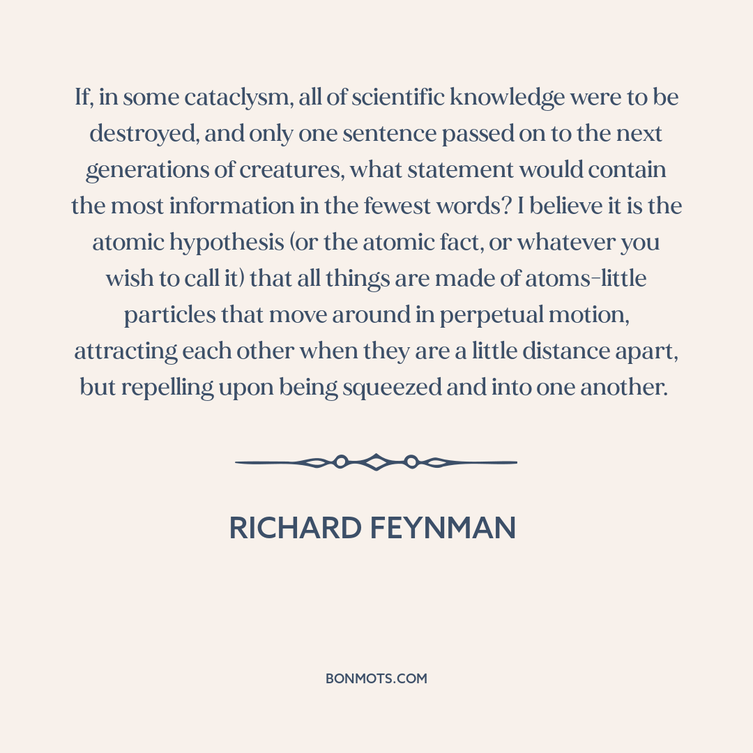 If, in some cataclysm, all of scientific knowledge were to be destroyed, and only one sentence passed on to the next generations of creatures, what statement would contain the most information in the fewest words? I believe it is the atomic hypothesis (or the atomic fact, or whatever you wish to call it) that all things are made of atoms-little particles that move around in perpetual motion, attracting each other when they are a little distance apart, but repelling upon being squeezed and into one another.