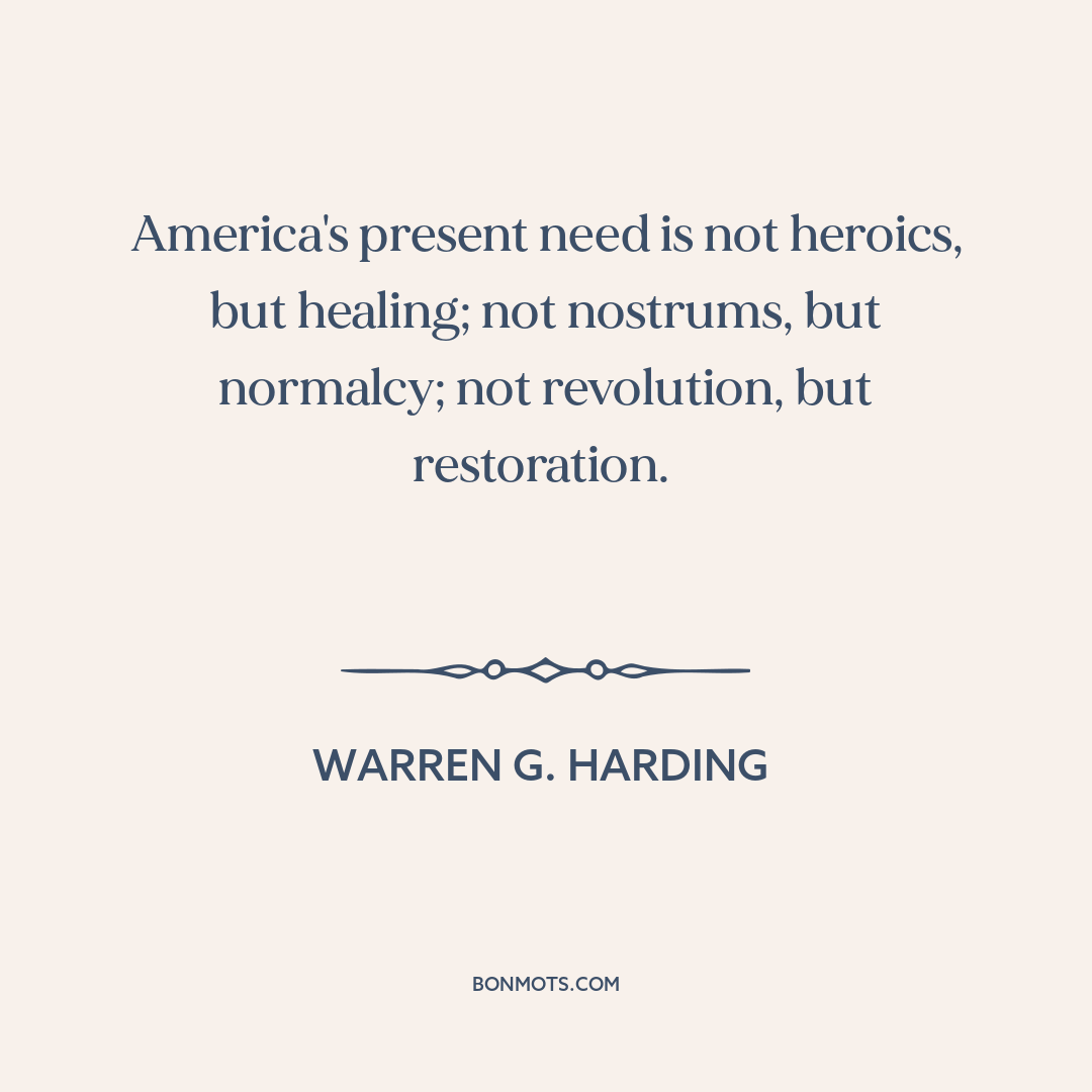 America's present need is not heroics, but healing; not nostrums, but normalcy; not revolution, but restoration.
