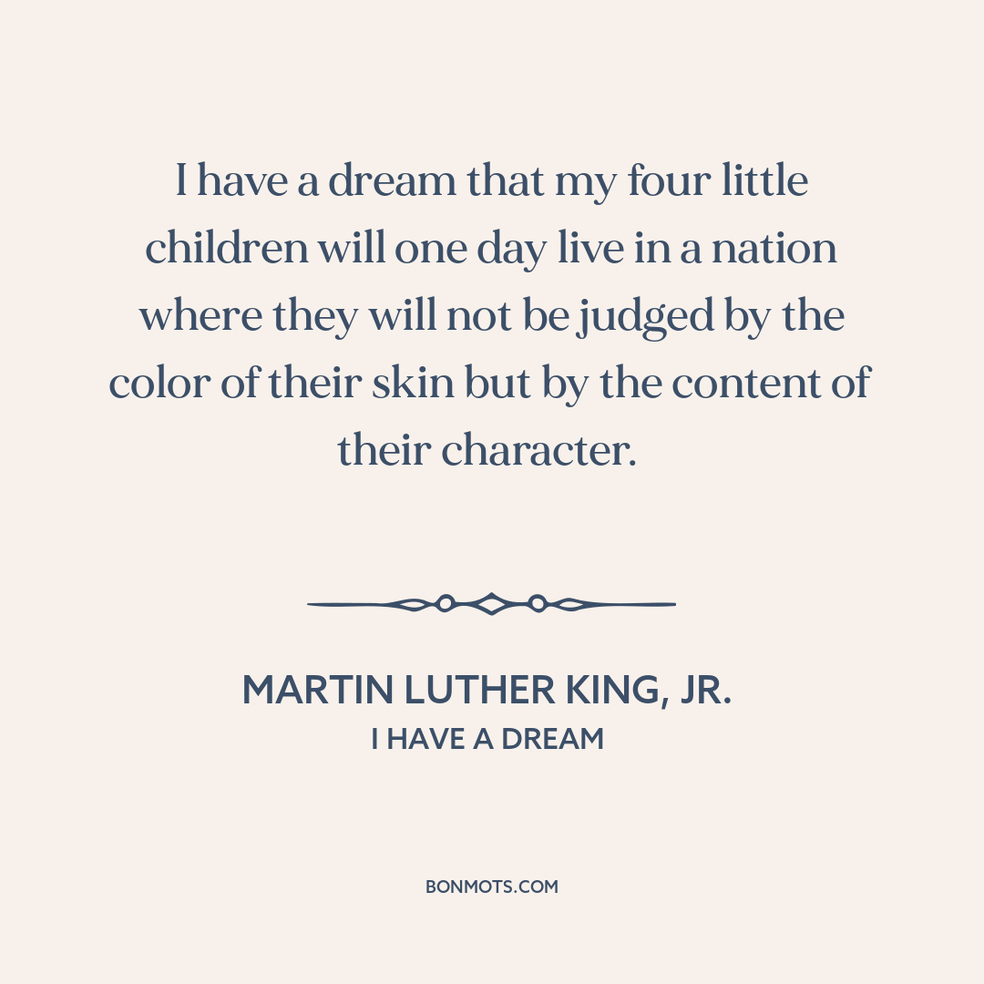 I have a dream that my four little children will one day live in a nation where they will not be judged by the color of their skin but by the content of their character.