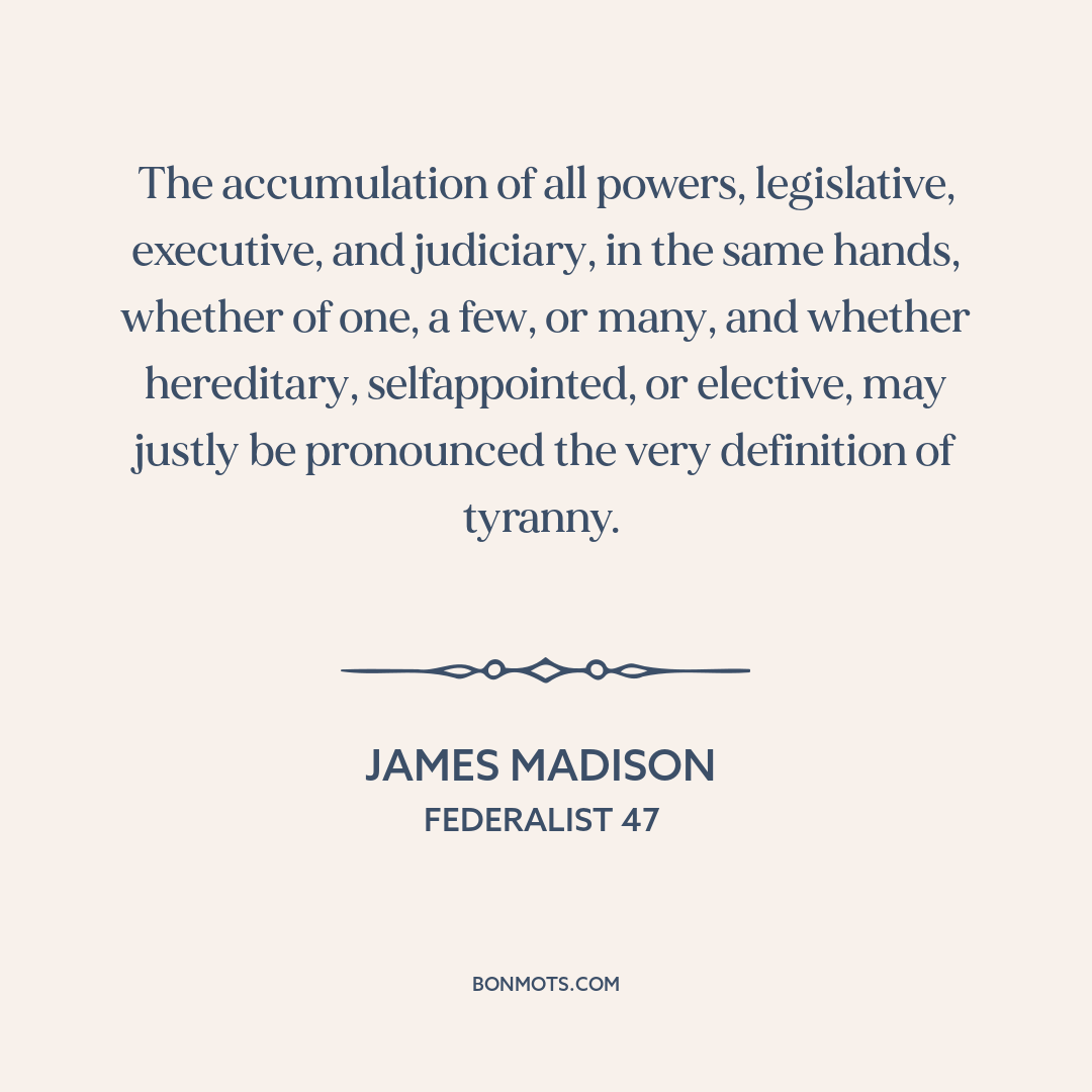 The accumulation of all powers, legislative, executive, and judiciary, in the same hands, whether of one, a few, or many, and whether hereditary, selfappointed, or elective, may justly be pronounced the very definition of tyranny.