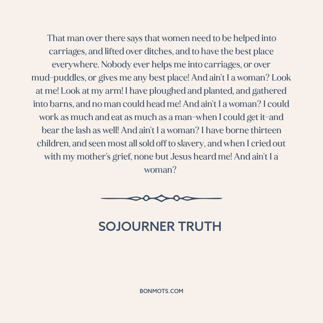 That man over there says that women need to be helped into carriages, and lifted over ditches, and to have the best place everywhere. Nobody ever helps me into carriages, or over mud-puddles, or gives me any best place! And ain't I a woman? Look at me! Look at my arm! I have ploughed and planted, and gathered into barns, and no man could head me! And ain't I a woman? I could work as much and eat as much as a man-when I could get it-and bear the lash as well! And ain't I a woman? I have borne thirteen children, and seen most all sold off to slavery, and when I cried out with my mother's grief, none but Jesus heard me! And ain't I a woman?