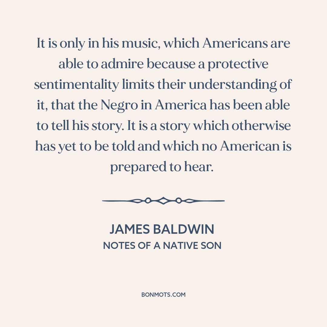 It is only in his music, which Americans are able to admire because a protective sentimentality limits their understanding of it, that the Negro in America has been able to tell his story. It is a story which otherwise has yet to be told and which no American is prepared to hear.