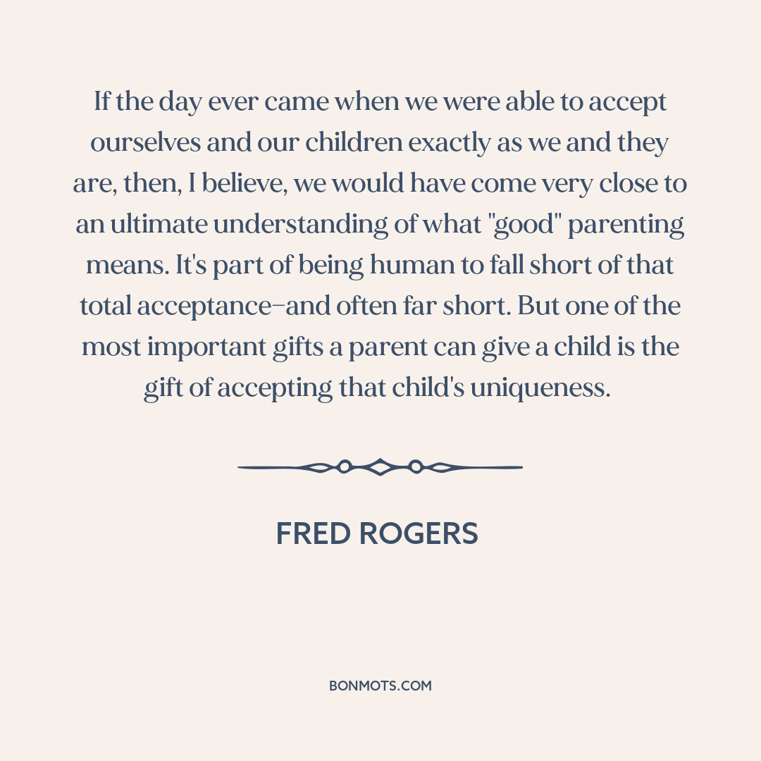 If the day ever came when we were able to accept ourselves and our children exactly as we and they are, then, I believe, we would have come very close to an ultimate understanding of what "good" parenting means. It's part of being human to fall short of that total acceptance—and often far short. But one of the most important gifts a parent can give a child is the gift of accepting that child's uniqueness.