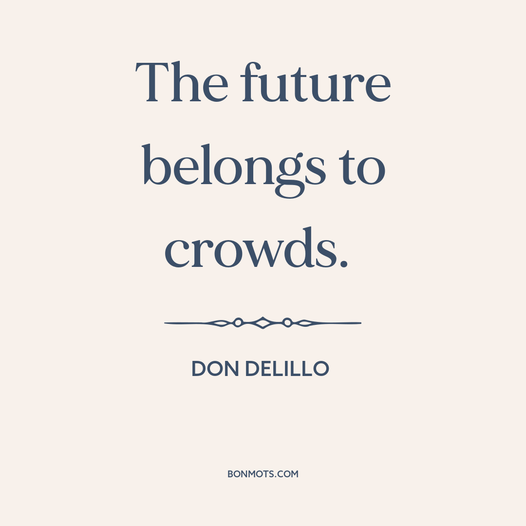 The future belongs to crowds. Don DeLillo Instagram sharing coming soon. Quote text and source copied to clipboard. Link to this quote copied to clipboard. More information about this quote Topic The masses The crowd Individual vs. the collective Author Don DeLillo Source Mao II Medium Novel Language English Time 1991 1990s 20th century Occupation Novelist Writer From United States Authentication Score 3 More information on Authentication Score coming soon. Citation DeLillo, Don. Mao II. Scribner, 1991. Citation text copied to clipboard.