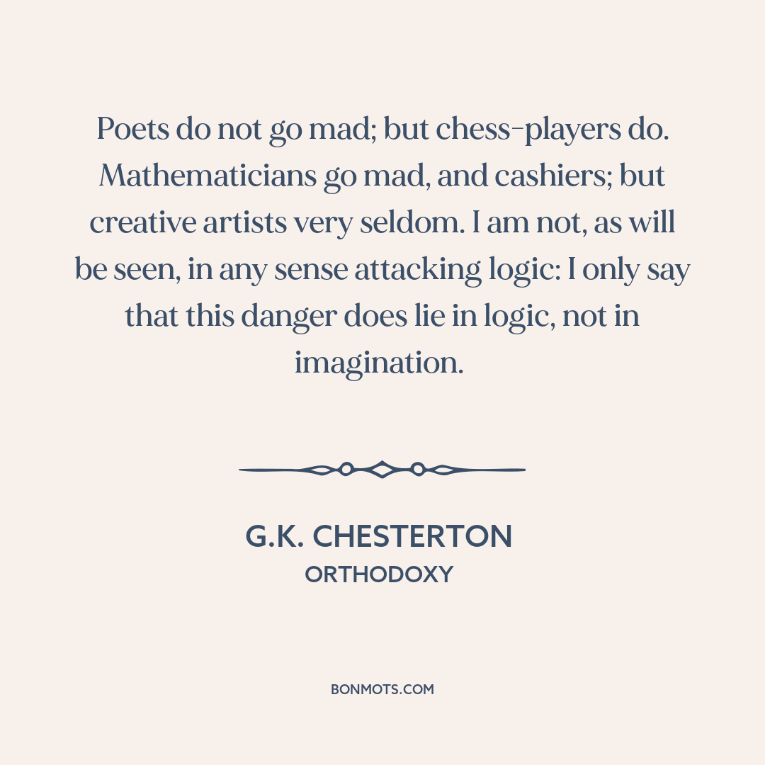 Poets do not go mad; but chess-players do. Mathematicians go mad, and cashiers; but creative artists very seldom. I am not, as will be seen, in any sense attacking logic: I only say that this danger does lie in logic, not in imagination.