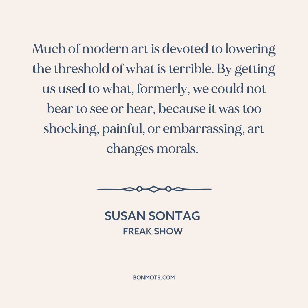Much of modern art is devoted to lowering the threshold of what is terrible. By getting us used to what, formerly, we could not bear to see or hear, because it was too shocking, painful, or embarrassing, art changes morals.