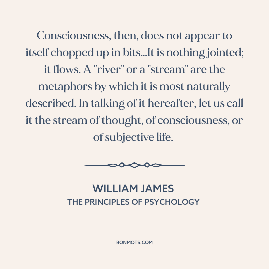Consciousness, then, does not appear to itself chopped up in bits…It is nothing jointed; it flows. A "river" or a "stream" are the metaphors by which it is most naturally described. In talking of it hereafter, let us call it the stream of thought, of consciousness, or of subjective life.