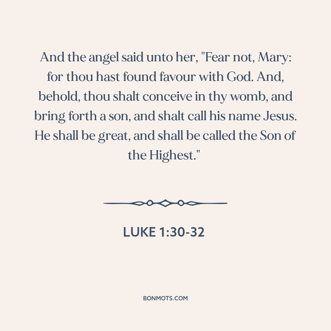 And the angel said unto her, "Fear not, Mary: for thou hast found favour with God. And, behold, thou shalt conceive in thy womb, and bring forth a son, and shalt call his name Jesus. He shall be great, and shall be called the Son of the Highest."