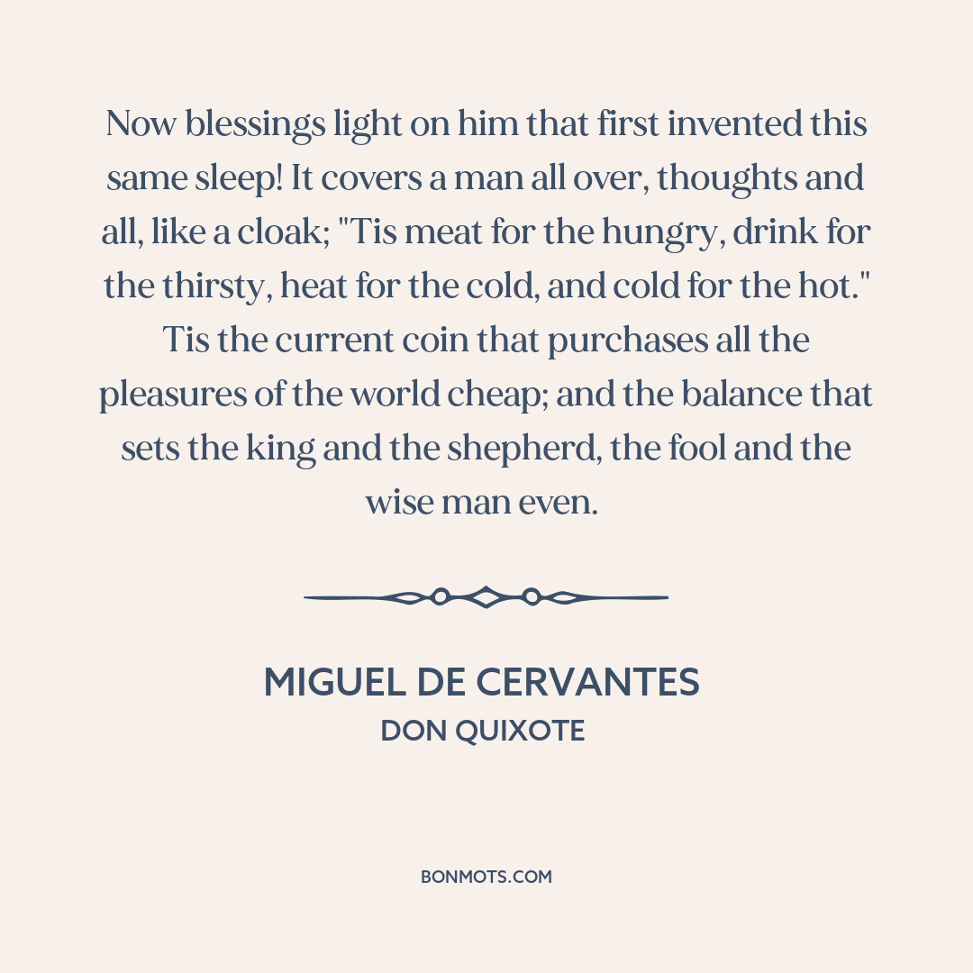 Now blessings light on him that first invented this same sleep! It covers a man all over, thoughts and all, like a cloak; "Tis meat for the hungry, drink for the thirsty, heat for the cold, and cold for the hot." Tis the current coin that purchases all the pleasures of the world cheap; and the balance that sets the king and the shepherd, the fool and the wise man even.