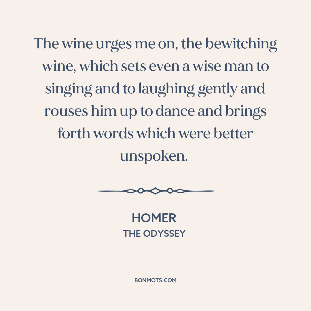 The wine urges me on, the bewitching wine, which sets even a wise man to singing and to laughing gently and rouses him up to dance and brings forth words which were better unspoken.