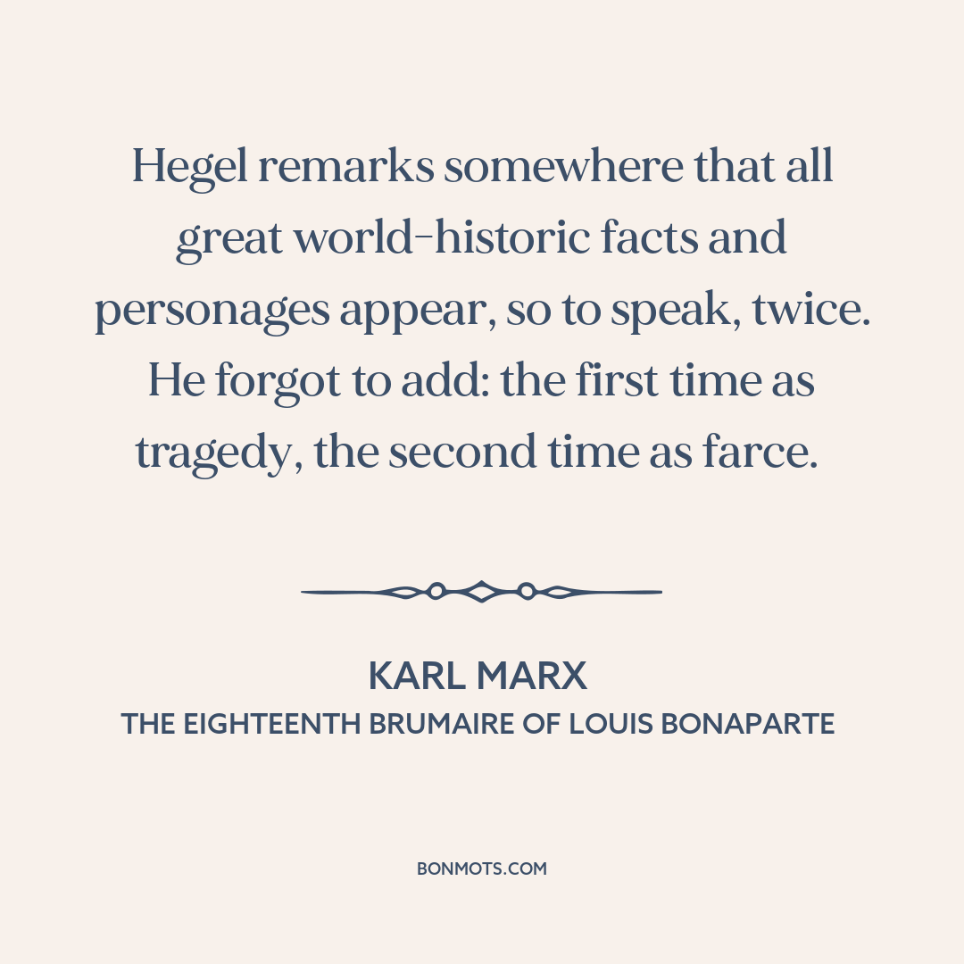 Hegel remarks somewhere that all great world-historic facts and personages appear, so to speak, twice. He forgot to add: the first time as tragedy, the second time as farce.