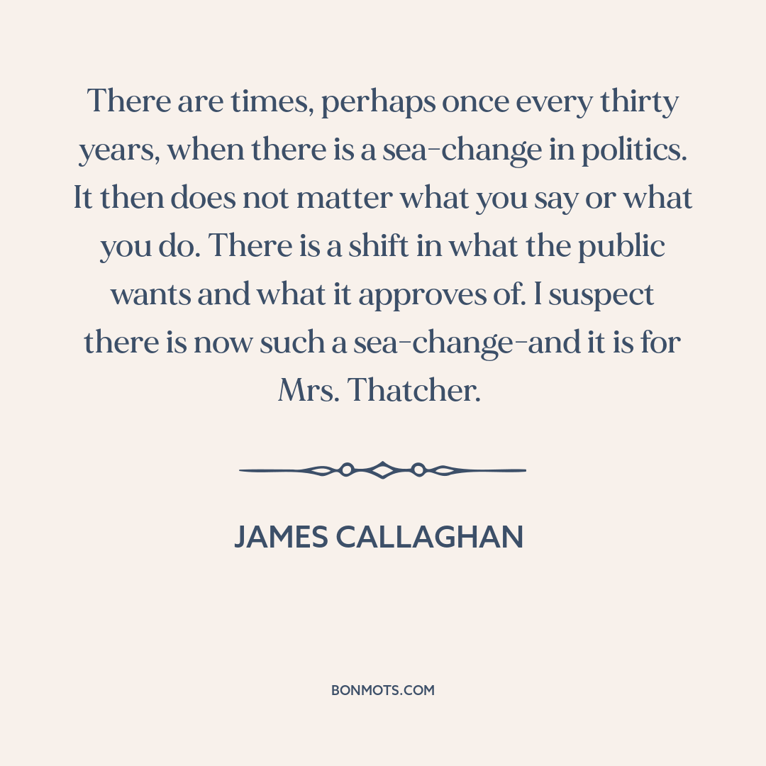 There are times, perhaps once every thirty years, when there is a sea-change in politics. It then does not matter what you say or what you do. There is a shift in what the public wants and what it approves of. I suspect there is now such a sea-change-and it is for Mrs. Thatcher.
