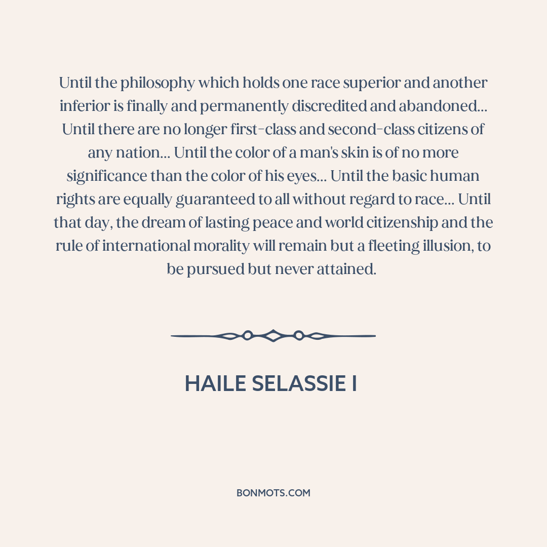 Until the philosophy which holds one race superior and another inferior is finally and permanently discredited and abandoned... Until there are no longer first-class and second-class citizens of any nation... Until the color of a man's skin is of no more significance than the color of his eyes... Until the basic human rights are equally guaranteed to all without regard to race... Until that day, the dream of lasting peace and world citizenship and the rule of international morality will remain but a fleeting illusion, to be pursued but never attained.