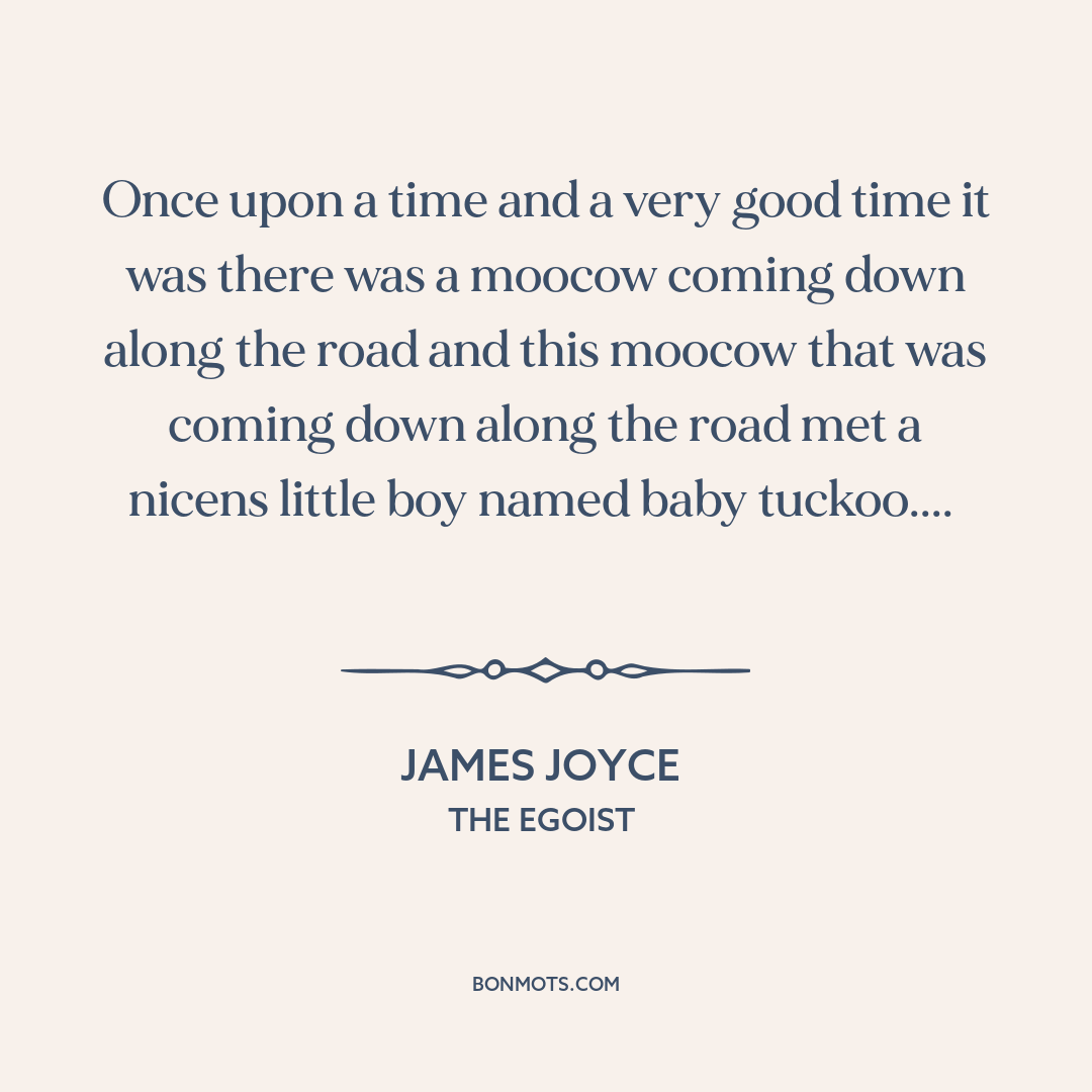 Once upon a time and a very good time it was there was a moocow coming down along the road and this moocow that was coming down along the road met a nicens little boy named baby tuckoo....