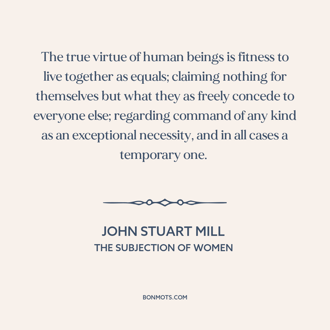 The true virtue of human beings is fitness to live together as equals; claiming nothing for themselves but what they as freely concede to everyone else; regarding command of any kind as an exceptional necessity, and in all cases a temporary one.