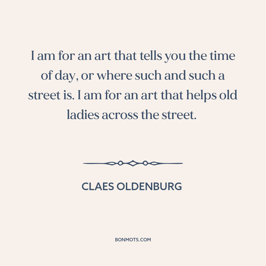 I am for an art that tells you the time of day, or where such and such a street is. I am for an art that helps old ladies across the street.