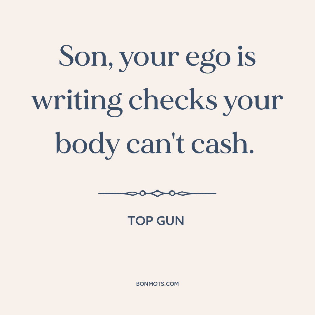 Son, your ego is writing checks your body can't cash. Top Gun Watch Top Gun at Amazon Watch Top Gun at Amazon Instagram sharing coming soon. Quote text and source copied to clipboard. Link to this quote copied to clipboard. More information about this quote Topic Ego Speaker Stinger Actor James Tolkan Source Top Gun Medium Film Genre Action (film) Drama (film) Action Drama Language English Time 1986 1980s 20th century Authentication Score 3 More information on Authentication Score coming soon. Citation Top Gun. Directed by Tony Scott, Paramount Pictures/Don Simpson/Jerry Bruckheimer Films, 1986. Citation text copied to clipboard.