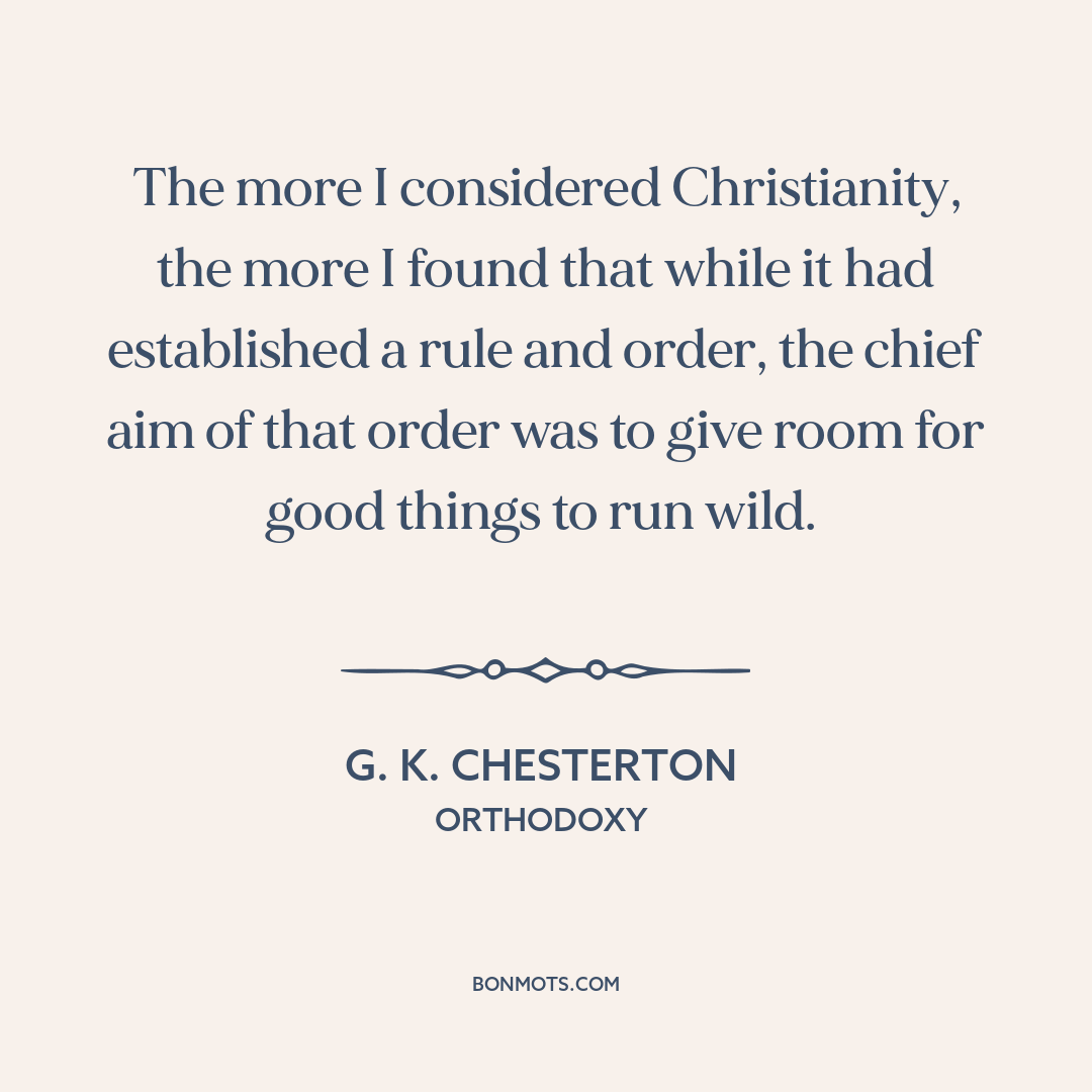 The more I considered Christianity, the more I found that while it had established a rule and order, the chief aim of that order was to give room for good things to run wild.