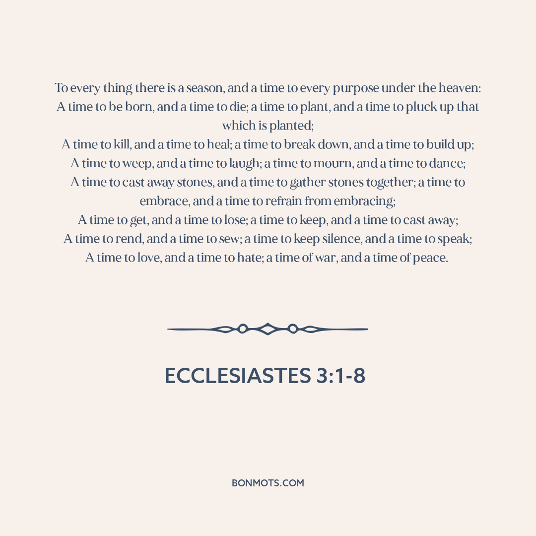 לַכֹּ֖ל זְמָ֑ן וְעֵ֥ת לְכָל־חֵ֖פֶץ תַּ֥חַת הַשָּׁמָֽיִם׃ ס עֵ֥ת לָלֶ֖דֶת וְעֵ֣ת לָמ֑וּת עֵ֣ת לָטַ֔עַת וְעֵ֖ת לַעֲקֹ֥ור נָטֽוּעַ׃ עֵ֤ת לַהֲרֹוג֙ וְעֵ֣ת לִרְפֹּ֔וא עֵ֥ת לִפְרֹ֖וץ וְעֵ֥ת לִבְנֹֽות׃ עֵ֤ת לִבְכֹּות֙ וְעֵ֣ת לִשְׂחֹ֔וק עֵ֥ת סְפֹ֖וד וְעֵ֥ת רְקֹֽוד׃ עֵ֚ת לְהַשְׁלִ֣יךְ אֲבָנִ֔ים וְעֵ֖ת כְּנֹ֣וס אֲבָנִ֑ים עֵ֣ת לַחֲבֹ֔וק וְעֵ֖ת לִרְחֹ֥ק מֵחַבֵּֽק׃ עֵ֤ת לְבַקֵּשׁ֙ וְעֵ֣ת לְאַבֵּ֔ד עֵ֥ת לִשְׁמֹ֖ור וְעֵ֥ת לְהַשְׁלִֽיךְ׃ עֵ֤ת לִקְרֹ֙ועַ֙ וְעֵ֣ת לִתְפֹּ֔ור עֵ֥ת לַחֲשֹׁ֖ות וְעֵ֥ת לְדַבֵּֽר׃ עֵ֤ת לֶֽאֱהֹב֙ וְעֵ֣ת לִשְׂנֹ֔א עֵ֥ת מִלְחָמָ֖ה וְעֵ֥ת שָׁלֹֽום׃ ס