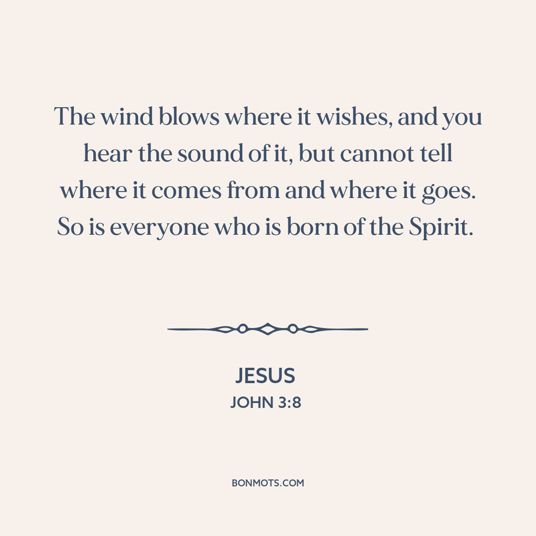 The wind blows where it wishes, and you hear the sound of it, but cannot tell where it comes from and where it goes. So is everyone who is born of the Spirit.