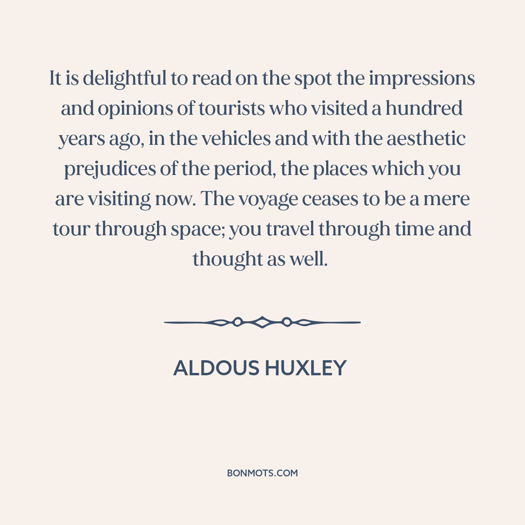 It is delightful to read on the spot the impressions and opinions of tourists who visited a hundred years ago, in the vehicles and with the aesthetic prejudices of the period, the places which you are visiting now. The voyage ceases to be a mere tour through space; you travel through time and thought as well.