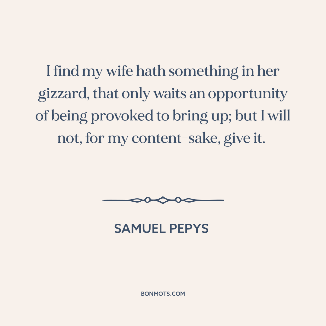 I find my wife hath something in her gizzard, that only waits an opportunity of being provoked to bring up; but I will not, for my content-sake, give it.