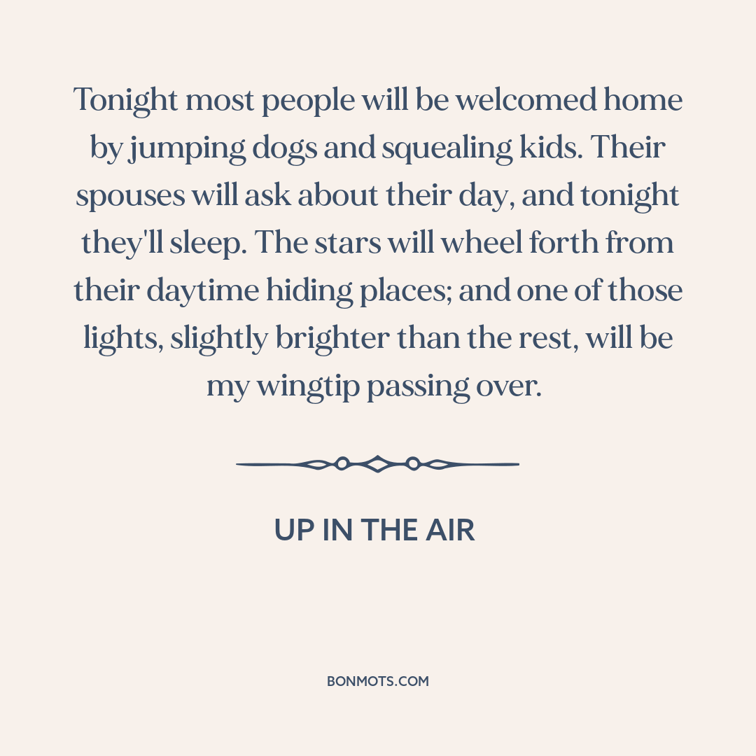 Tonight most people will be welcomed home by jumping dogs and squealing kids. Their spouses will ask about their day, and tonight they'll sleep. The stars will wheel forth from their daytime hiding places; and one of those lights, slightly brighter than the rest, will be my wingtip passing over.