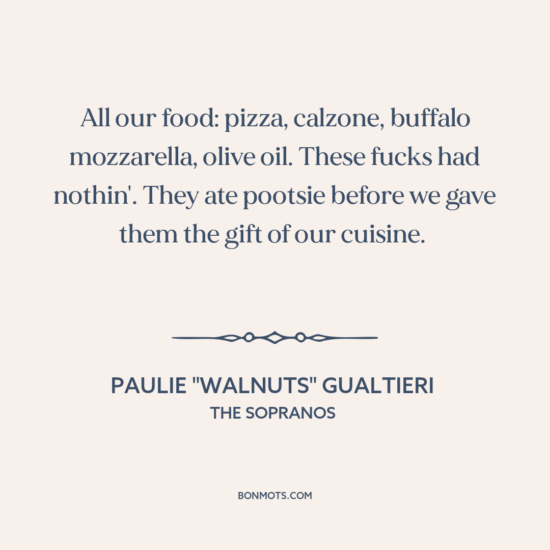 All our food: pizza, calzone, buffalo mozzarella, olive oil. These fucks had nothin'. They ate pootsie before we gave them the gift of our cuisine.