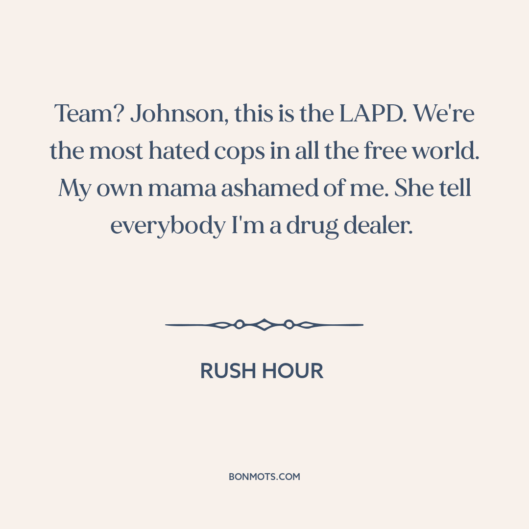 Team? Johnson, this is the LAPD. We're the most hated cops in all the free world. My own mama ashamed of me. She tell everybody I'm a drug dealer.