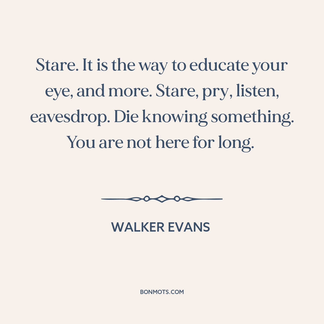 Stare. It is the way to educate your eye, and more. Stare, pry, listen, eavesdrop. Die knowing something. You are not here for long.