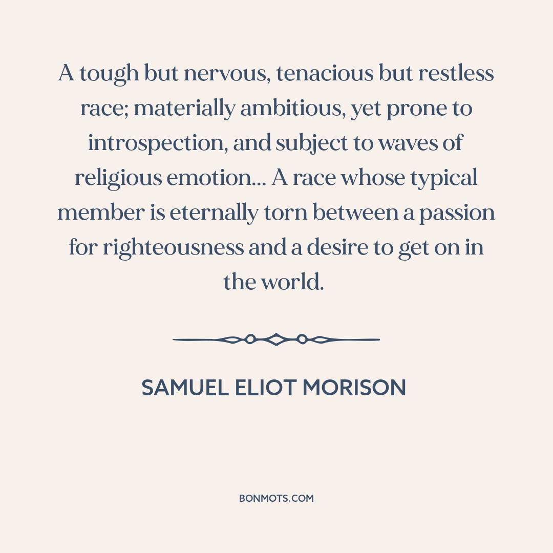 A tough but nervous, tenacious but restless race; materially ambitious, yet prone to introspection, and subject to waves of religious emotion... A race whose typical member is eternally torn between a passion for righteousness and a desire to get on in the world.