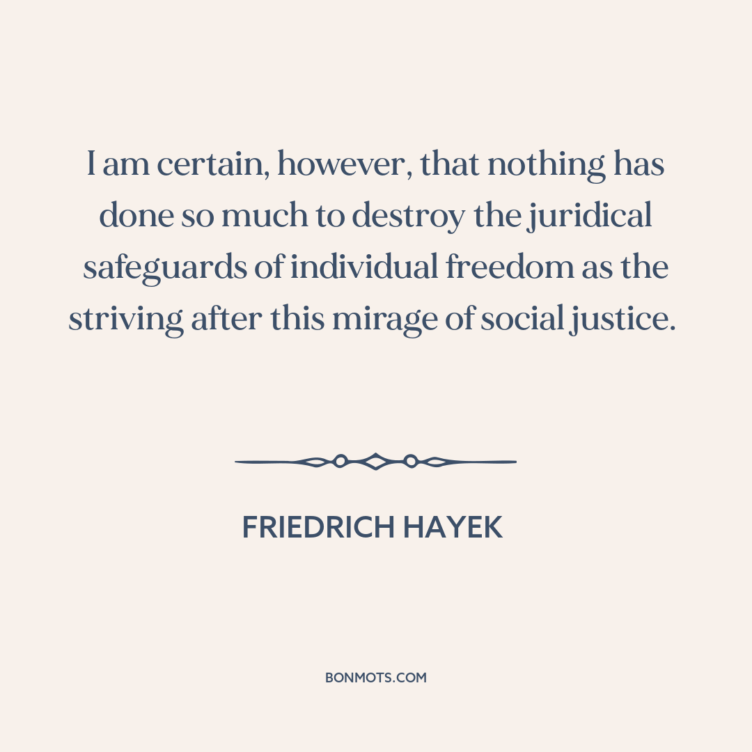 I am certain, however, that nothing has done so much to destroy the juridical safeguards of individual freedom as the striving after this mirage of social justice.
