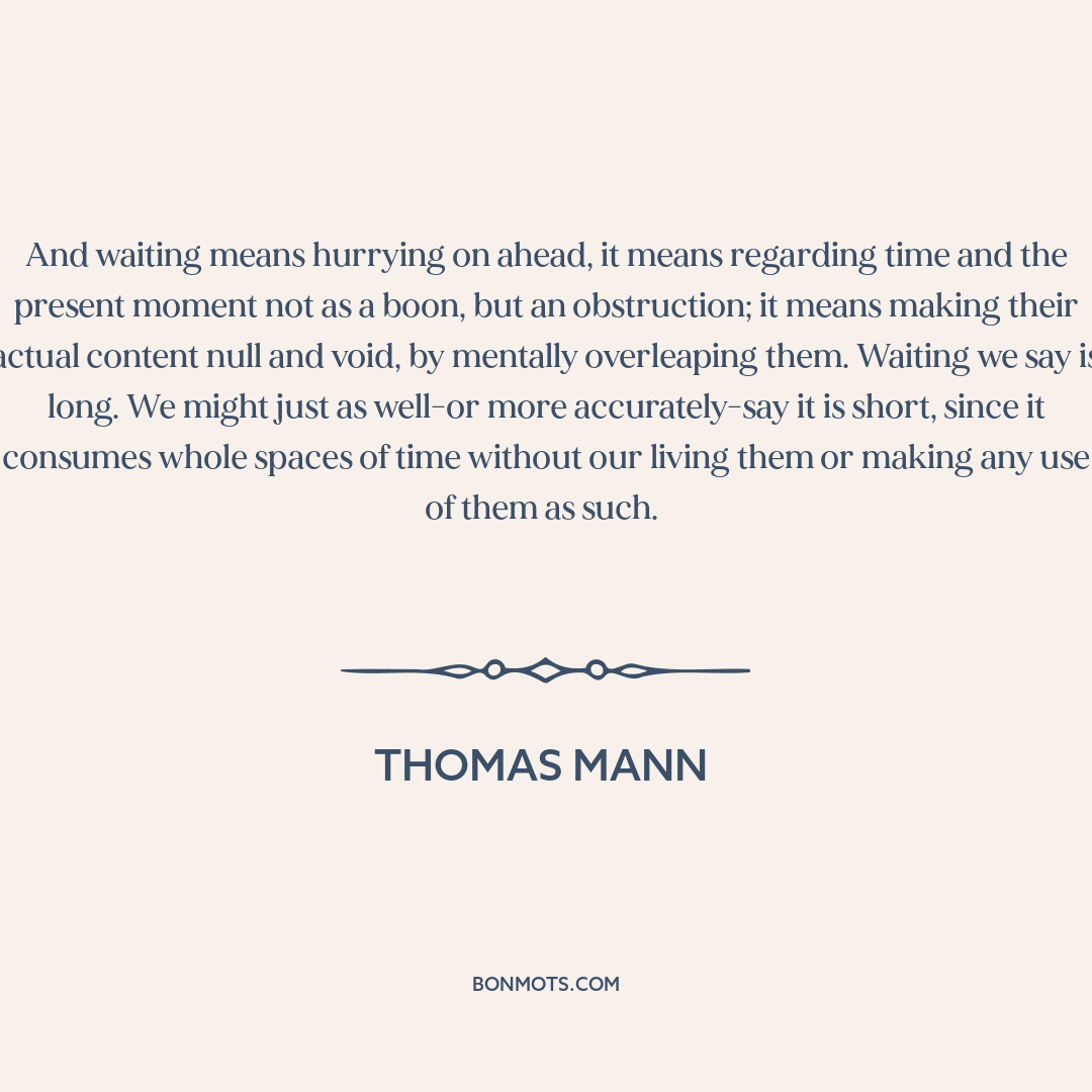 And waiting means hurrying on ahead, it means regarding time and the present moment not as a boon, but an obstruction; it means making their actual content null and void, by mentally overleaping them. Waiting we say is long. We might just as well-or more accurately-say it is short, since it consumes whole spaces of time without our living them or making any use of them as such.