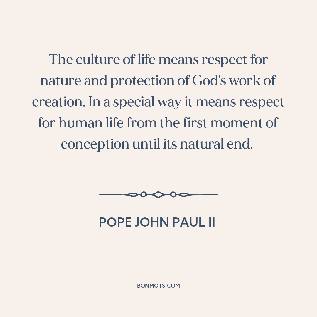 The culture of life means respect for nature and protection of God's work of creation. In a special way it means respect for human life from the first moment of conception until its natural end.