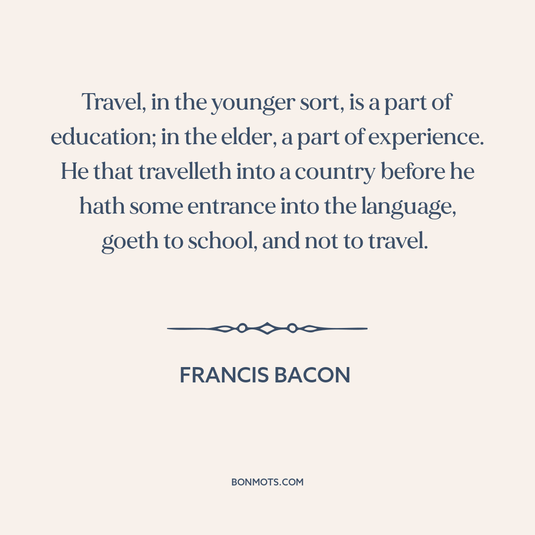 Travel, in the younger sort, is a part of education; in the elder, a part of experience. He that travelleth into a country before he hath some entrance into the language, goeth to school, and not to travel.