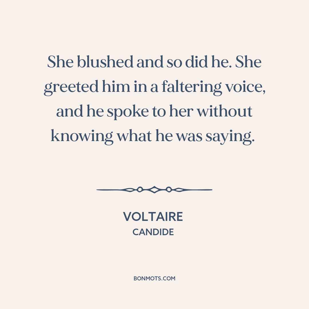 She blushed and so did he. She greeted him in a faltering voice, and he spoke to her without knowing what he was saying.