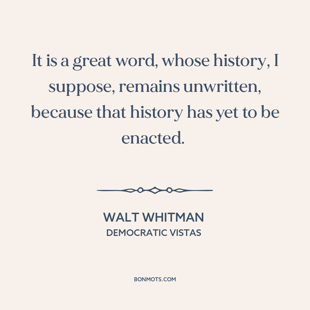 It is a great word, whose history, I suppose, remains unwritten, because that history has yet to be enacted.
