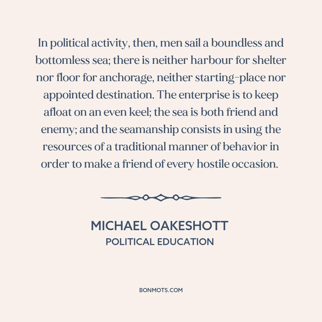 In political activity, then, men sail a boundless and bottomless sea; there is neither harbour for shelter nor floor for anchorage, neither starting-place nor appointed destination. The enterprise is to keep afloat on an even keel; the sea is both friend and enemy; and the seamanship consists in using the resources of a traditional manner of behavior in order to make a friend of every hostile occasion.