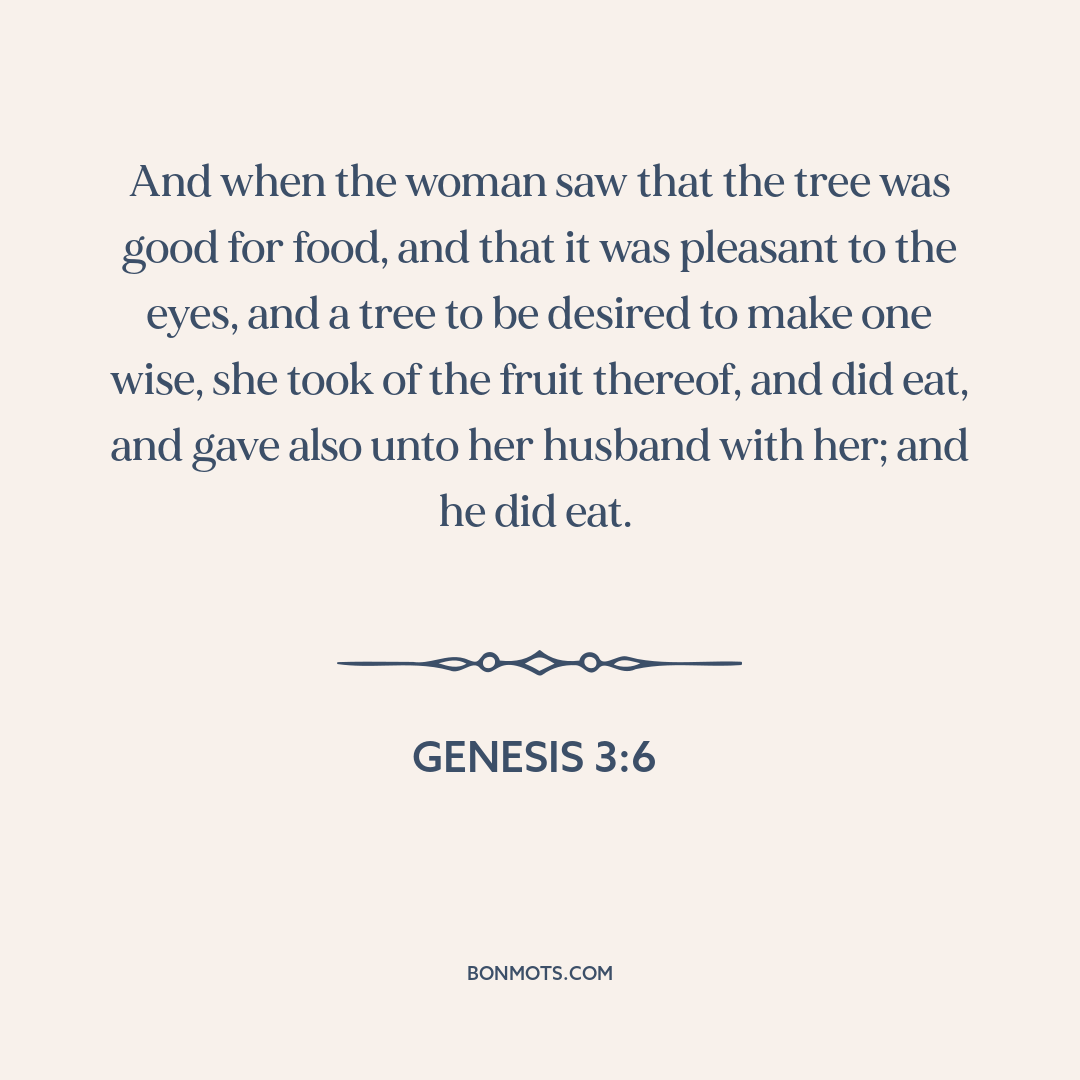 And when the woman saw that the tree was good for food, and that it was pleasant to the eyes, and a tree to be desired to make one wise, she took of the fruit thereof, and did eat, and gave also unto her husband with her; and he did eat.