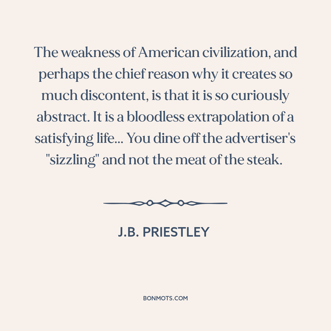 The weakness of American civilization, and perhaps the chief reason why it creates so much discontent, is that it is so curiously abstract. It is a bloodless extrapolation of a satisfying life... You dine off the advertiser's "sizzling" and not the meat of the steak.