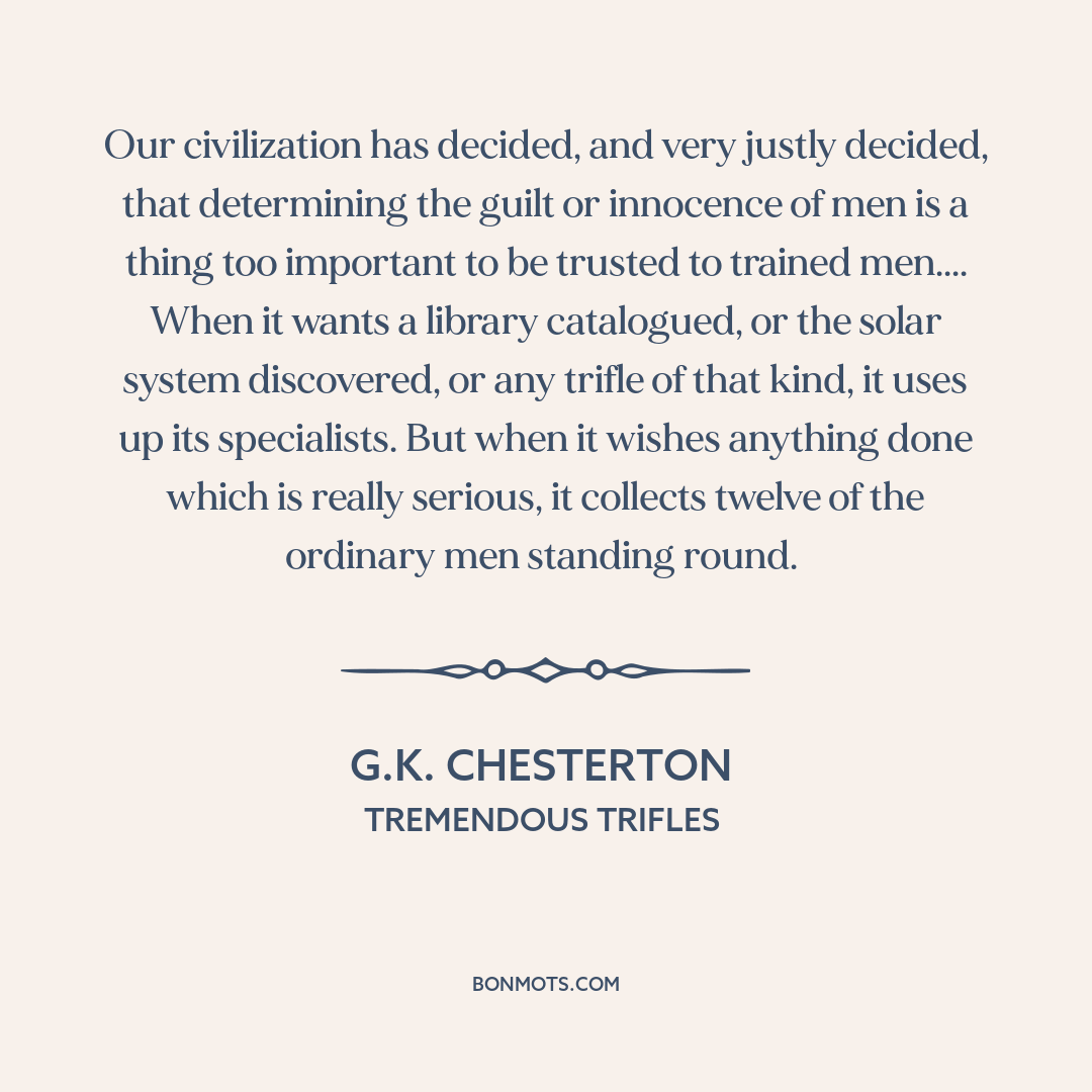 Our civilization has decided, and very justly decided, that determining the guilt or innocence of men is a thing too important to be trusted to trained men.... When it wants a library catalogued, or the solar system discovered, or any trifle of that kind, it uses up its specialists. But when it wishes anything done which is really serious, it collects twelve of the ordinary men standing round.