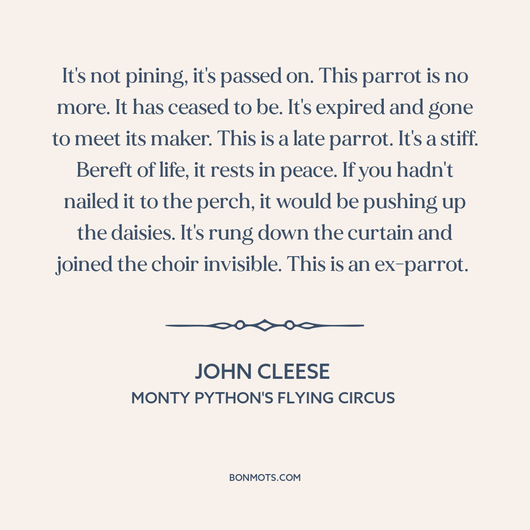 It's not pining, it's passed on. This parrot is no more. It has ceased to be. It's expired and gone to meet its maker. This is a late parrot. It's a stiff. Bereft of life, it rests in peace. If you hadn't nailed it to the perch, it would be pushing up the daisies. It's rung down the curtain and joined the choir invisible. This is an ex-parrot.