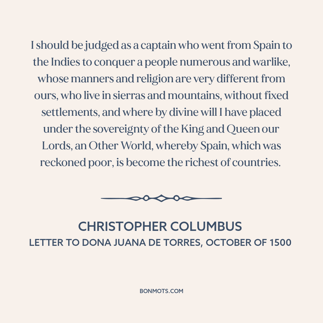 I should be judged as a captain who went from Spain to the Indies to conquer a people numerous and warlike, whose manners and religion are very different from ours, who live in sierras and mountains, without fixed settlements, and where by divine will I have placed under the sovereignty of the King and Queen our Lords, an Other World, whereby Spain, which was reckoned poor, is become the richest of countries.
