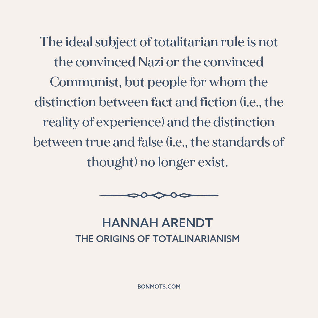 The ideal subject of totalitarian rule is not the convinced Nazi or the convinced Communist, but people for whom the distinction between fact and fiction (i.e., the reality of experience) and the distinction between true and false (i.e., the standards of thought) no longer exist.