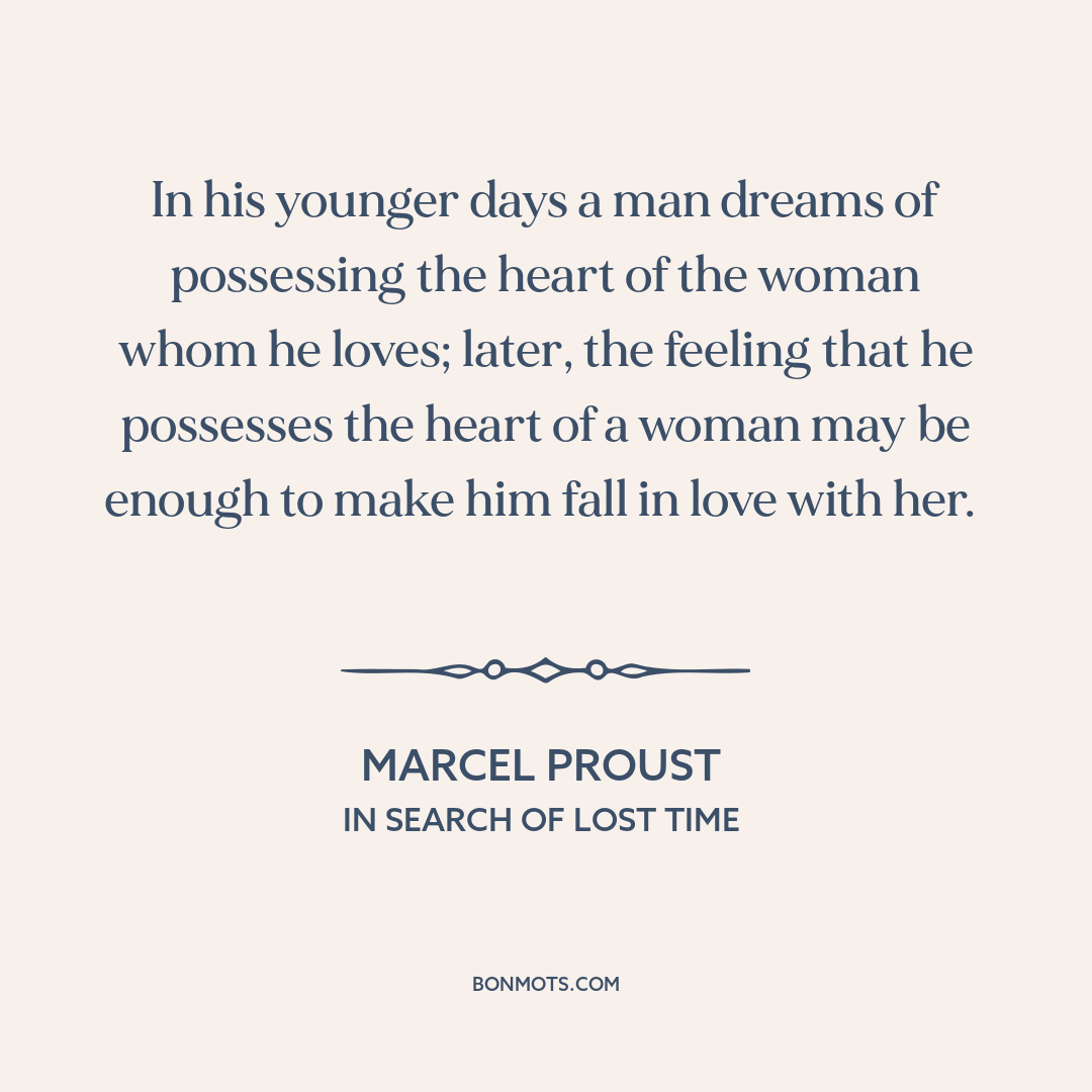 In his younger days a man dreams of possessing the heart of the woman whom he loves; later, the feeling that he possesses the heart of a woman may be enough to make him fall in love with her.