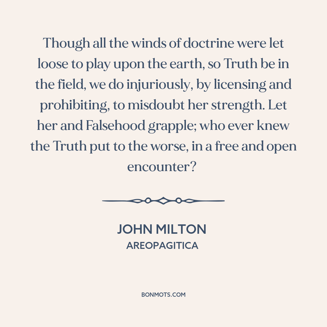 Though all the winds of doctrine were let loose to play upon the earth, so Truth be in the field, we do injuriously, by licensing and prohibiting, to misdoubt her strength. Let her and Falsehood grapple; who ever knew the Truth put to the worse, in a free and open encounter?